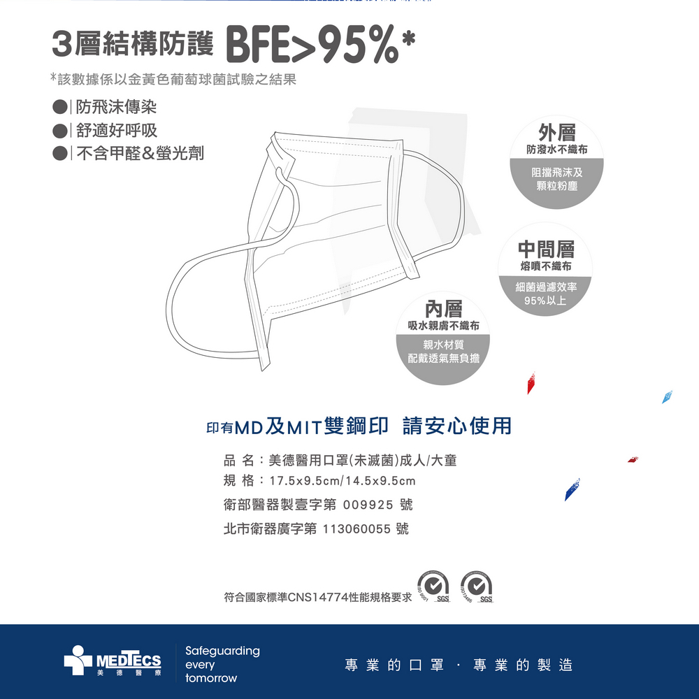 提醒您:個人防護裝備屬個人衛生用品,依據相關法規,拆封後恕不適用七日鑑賞期及退貨服務。為維護消費者權益,敬請於拆封前確認商品無誤。若有任何疑問,歡迎聯繫美德客服,我們將竭誠為您服務,謝謝。