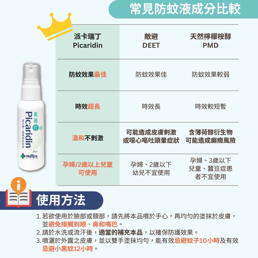 3.噴灑於外露之皮膚,並以雙手塗抹均勻,能有效忌避蚊子10小時及有效忌避小黑蚊12小時。