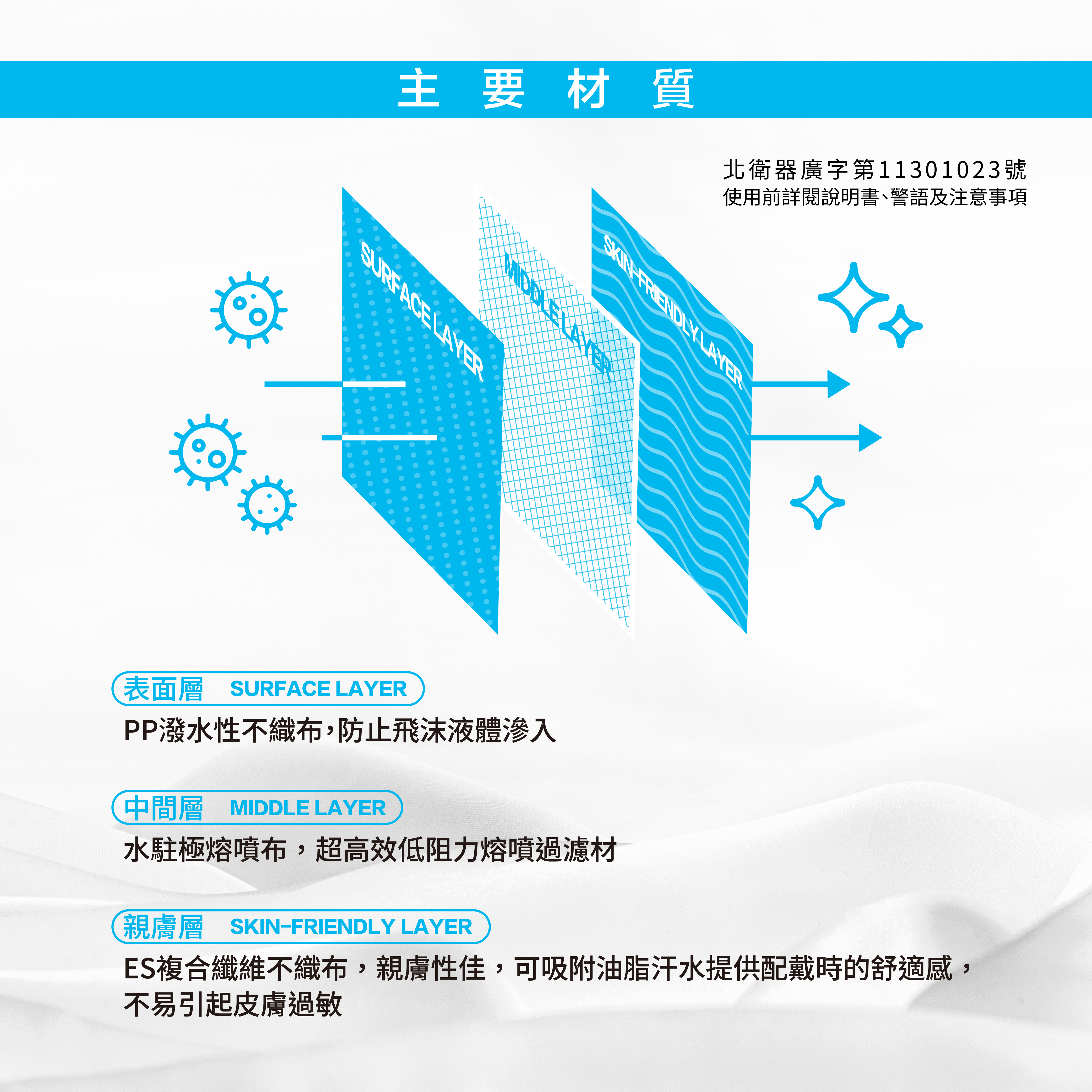 細菌過濾效率(BFE)>99% ,0.075微米粒狀物過濾率(PFE)平均98.83%